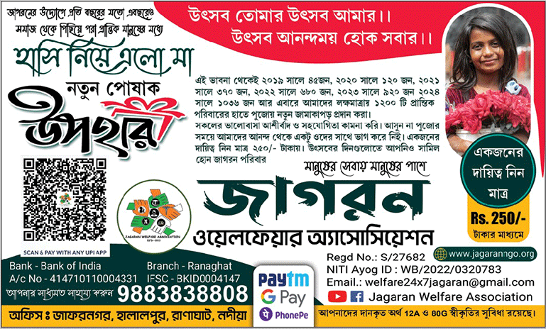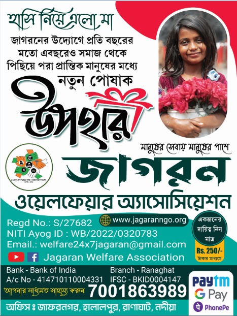 “Jagaran is a dedicated youth organisation working for a decade for the betterment of the livelihood of the villages under Ranaghat Block II area. Not only development of cultural and academic consciousness, members are dedicated to extend their hand during blood emergency, natural disaster as well as during COVID period members made arrangements of daily rations and oxygen service on regular basis for the needy people.. Long live Jagaran..”